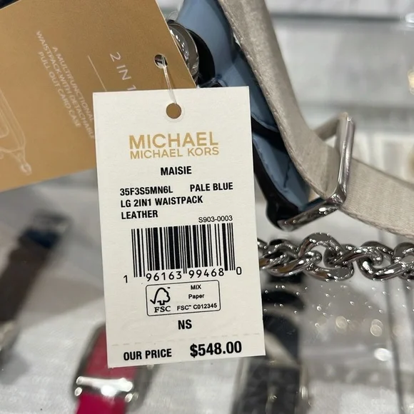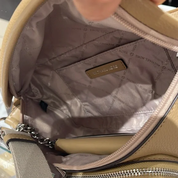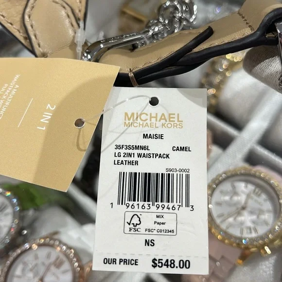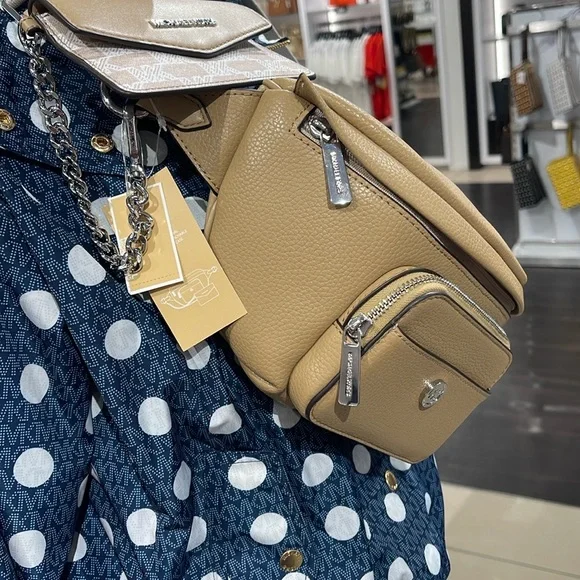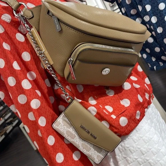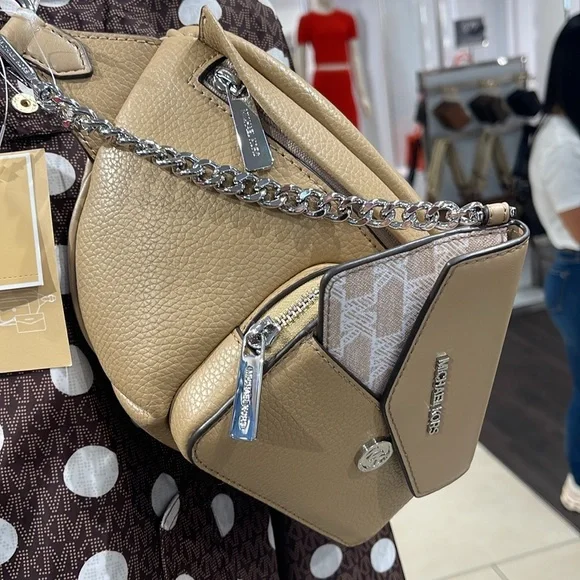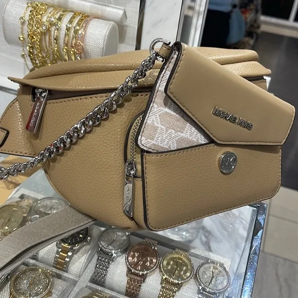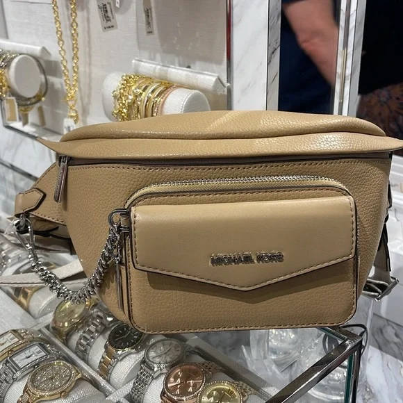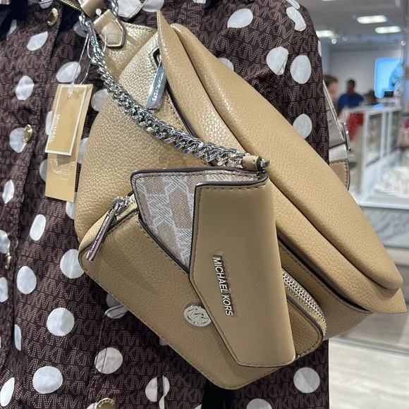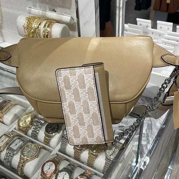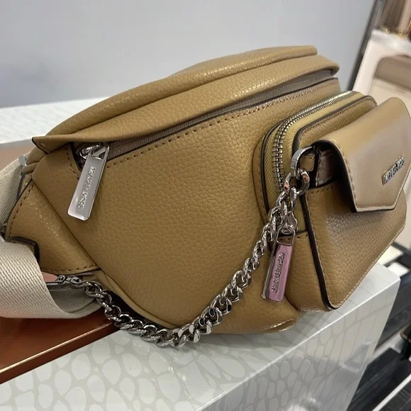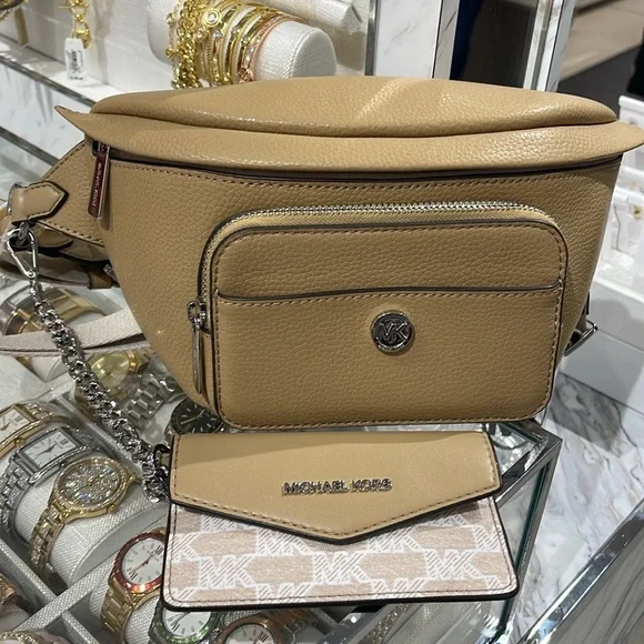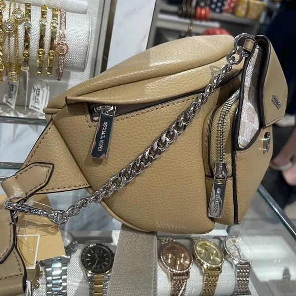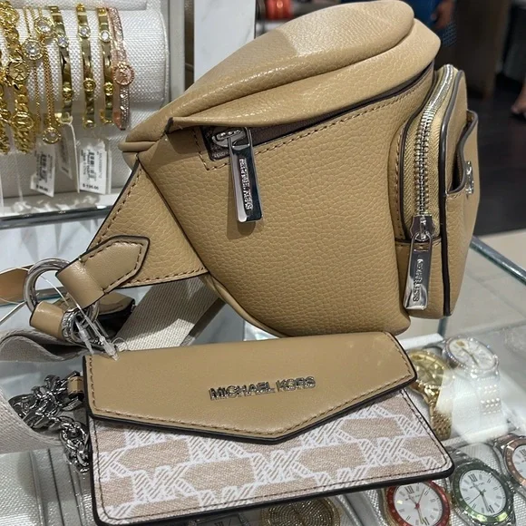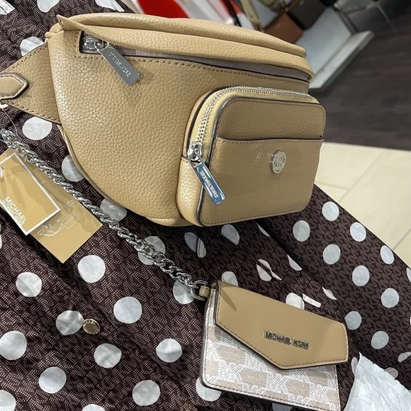 Michael Kors Maisie Large Pebbled Leather 2-in-1 Sling Pack Fanny Pack Waist Belt Bag Crossbody Camel NWTAuthentic Maisie waist pack is a street-chic essential for off-duty days. Crafted from sleek pebbled leather, this clever 2-in-1 style includes a hidden Signature print card case that slides neatly into the front pocket to look like an integrated part of the design. Attached by a chain strap, it can be removed and carried solo when you’d rather travel light.• 100% leather from tanneries meeting the highest standards of environmental performance• 2-in-1 sling pack• Pebbled leather/logo-print canvas• Fabric 1: 100% leather• Fabric 2: 89.4% coated canvas/9.6% polyester/1% polyurethane• Trim: 52% polyurethane/48% polyester• Silver-tone hardware• 11”W X 3.75”H X 3.75”D• Adjustable strap: 19.5”- 21.5”• Exterior details: front zip and slip pockets• Interior details: back slip pocket• Removable card caseMICHAEL KORSMAISIE35F3S5MN6LCAMELLG 2IN1 WAISTPACKLEATHER